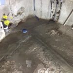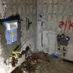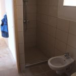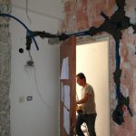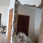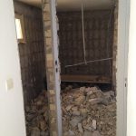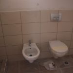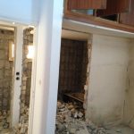 Walls were demolished, as well as the existing bathroom and kitchen. A new bathroom was created with shower corner, toilet, bidet and sink.
